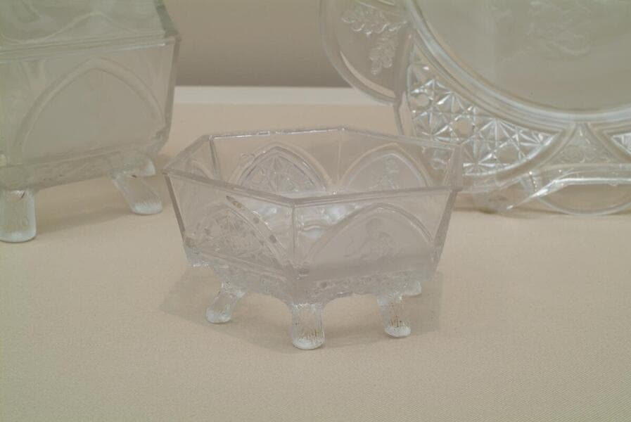 Gillinder's popular "Pioneer" pattern was introduced about the time of the United States' Centennial celebration in 1876. With its frontier theme, complete with log cabin, buffalo, deer, and kneeling Native American, this pattern—known today as "Westward Ho"—reflects a national nostalgia for the fast-disappearing Western wilderness.