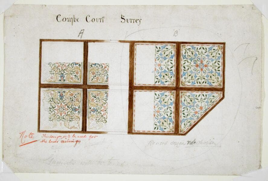 Seven square panels and one triangular, outlined in brown, as if to imitate wood; the four on the left show pink tulips forming central octagon, yellow acanthus leaves, green vines and blue flowers radiating outwards; four on right show pink lilies (?) forming central square, blue acanthus leaves and green leafy vines radiating outwards.