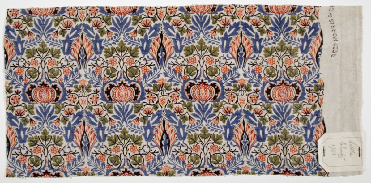Little Chintz shows Morris using motifs similar to those in the Snakeshead fabric (on display in the entrance) with the patterns arranged in parallel rows. Morris, however, has introduced variety by making the pattern more symmetrical here than in earlier designs. Although Morris was never completely happy with the colors supplied to him by Wardle, the printworks in Staffordshire printed many Morris & Co. fabrics from 1875 to 1909. By 1878, Wardle was producing fourteen designs for Morris & Co., including Iris, Snakeshead, and Little Chintz. All three of these designs were inspired by contemporary imported Indian fabrics, which were readily available in many fashionable London shops.