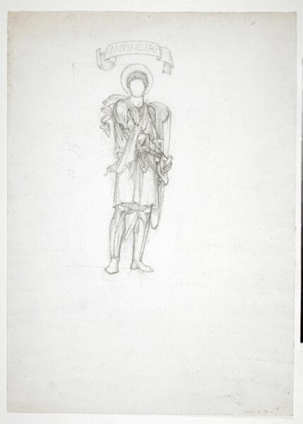 Various hand studies, shown in armor holding swords. Lower left shows figure grasping sword in both hands turned to right; the right of the page shows larger armored figure holding shield and sword. Verso shows standing figure in armor and drapery, haloed, right arm crossing chest to grasp sword at left side, left arm holding shield. A banner above his head reads "AUDACIA"