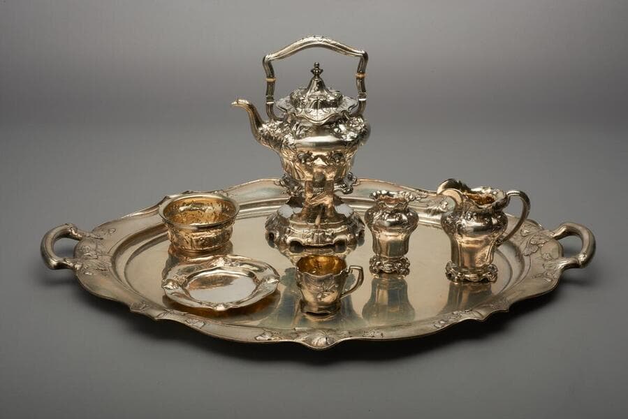 In response to the growing popularity of handwrought metals, Gorham introduced a line of silver called Martelé in the late 1890s. Taking its name from the French word for hand-hammered, Martelé silver was designed under the direction of William C. Codman and produced by some of the company's finest craftsmen. Registering the Martelé trademark in 1899, Gorham introduced its new line at the 1900 Paris Exposition to great popular and critical acclaim. The long, flowing lines, asymmetry, and naturalism of Martelé silver all reflect the influence of French Art Nouveau. While not a matched set, this tea service, with its curvilinear forms and distinctly handwrought character, is typical of Gorham's finest Martelé silver.