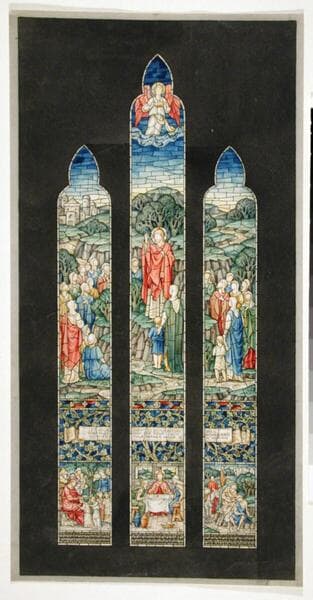 Sermon on the Mount shown across three lights, with angel at top of central light. Christ standing in center, figures gathered in left and right lights. Landscape background. Below, scroll across foliage ground reading "LET YOUR LIGHT SO SHINE BEFORE MEN / THAT THEY MAY SEE YOUR GOOD WORKS AND / GLORIFY YOUR FATHER WHICH IS IN HEAVEN". Below this are scenes of Christ Blessing Children, Supper at Emmaus, Good Samaritan.