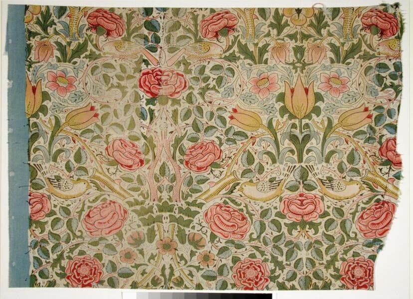 White ground with intertwining pink rose vines - vine stems are yellow and pink, small yellow birds perched at various intervals. Small piece at top sewn in (to replace worn fabric or a tear?) - colors are brighter on this piece