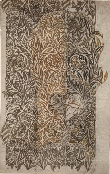 Although the influence of contemporary Indian textiles is apparent in this design, Morris also found inspiration in a German printed linen purported to be from the fifteenth century that he had studied at the South Kensington Museum. Morris also employs a willow motif, a popular contemporary pattern, in the background. As with wallpaper, Morris had specific ideas on how the woodblocks for textile printing should be cut. He has added instructions to the block-cutter on this design, noting that: "The block must have square ends that is it must not follow the shape of the pattern."