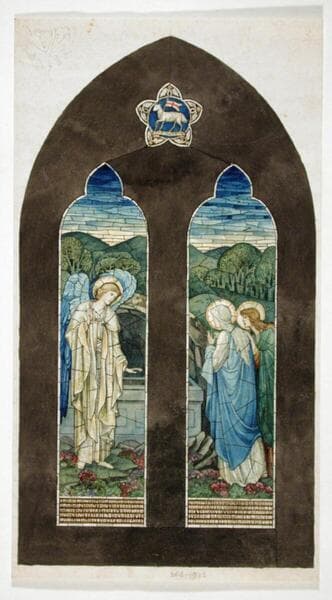 Two lancet windows, left showing angel standing by empty sepulchre, right shows two Marys in blue and green cloaks; landscape background; multifoil above with white horse and British flag (red cross on white ground)