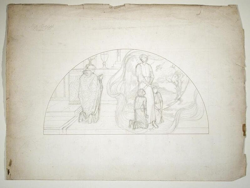 Semi-circle outline, filled with scene of priest before an altar on his knees- decorated robes - to his left, a scnee outlines in wavy lines, as if a vision; an angel standing touching heads of two kneeling people, while treading on object with left foot.