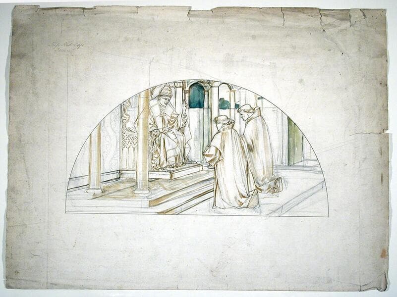 Semi-circle in black outline- depicting inside of temple with columns - seated on throne is pope figure holding up left hand in sign of blessing, two monk figures kneeling before him - filled with brown wash same green at upper right.