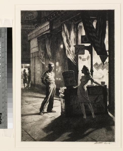 Chance Meeting is one of Martin Lewis's most psychologically complex images, as Lewis placed the viewer in the center of a narrative fraught with unresolved desire. Both figures strike casual poses-the man thrusts his hands in his pockets while the woman leans on a newsstand. However, their intense gazes and the exaggerated arcs of their bodies suggest an ardent attraction. In the background, Lewis included a couple further along in their courtship, suggesting a possible outcome to the encounter. The harsh lighting, dramatic shadows, and incomplete story suggest the influence of film noir on Lewis's work.