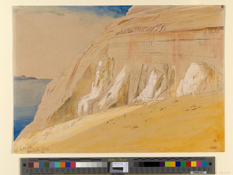 In 1867, Lear, an ardent traveler, returned to Egypt and traveled further south than he ever had before—to the border of Sudan. There he made a pencil sketch (to which he later added watercolor) of the four colossal statues at Abou Simbl (Abu Simbel). Lear visited the site at sunrise, considered the best time of day to view the east-facing statues. He captures the dramatic effect of the figures glowing in the morning sun with white highlights against warm yellow and orange tones. A pair of seated figures in front of one of the statues suggests the immensity of the ancient carvings (2022).