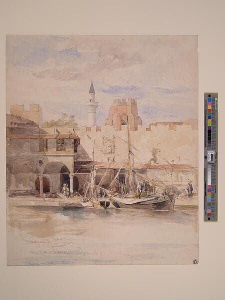 This watercolor exhibits the confident handling and broad washes of color for which Müller was well known. The artist had spent three months in the Eastern Mediterranean, and by the time he reached the Greek island of Rhodes, he had run out of several colors, including cobalt, which may explain the muted tones of this example. Despite the lack of certain pigments, this drawing reveals Müller’s understanding of watercolor’s ability to capture the transitory effects of light. Feathery touches of transparent colors mimic rippling on the water’s surface (2022).