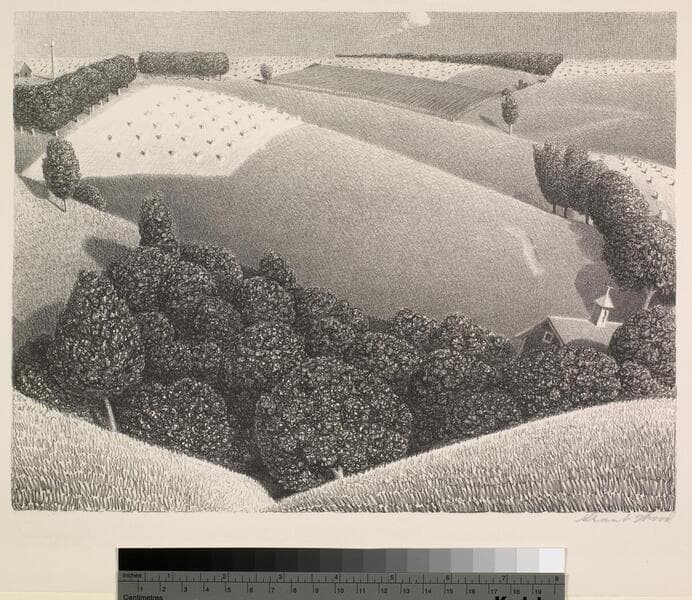 Thomas Craven, a critic who championed Regionalism, called this lithograph "the very essence of fertility…the portrait of America's most valuable wealth. No dust bowl here, no starved cattle or skulls bleaching on cracked surfaces." Wood's images of farming ignore the massive displacement of farmers due to the Dust Bowl and mechanization. Between 1920 and 1950 the number of American farmers decreased by almost nine million, as people left the Great Plains for opportunities elsewhere.
