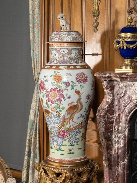 In addition to French decorative art and British paintings, Henry and Arabella Huntington collected a number of antique Asian ceramic pieces to display in their home. This large lidded vase, one of a pair, is decorated with motifs of phoenixes, peonies, and various other flowers.