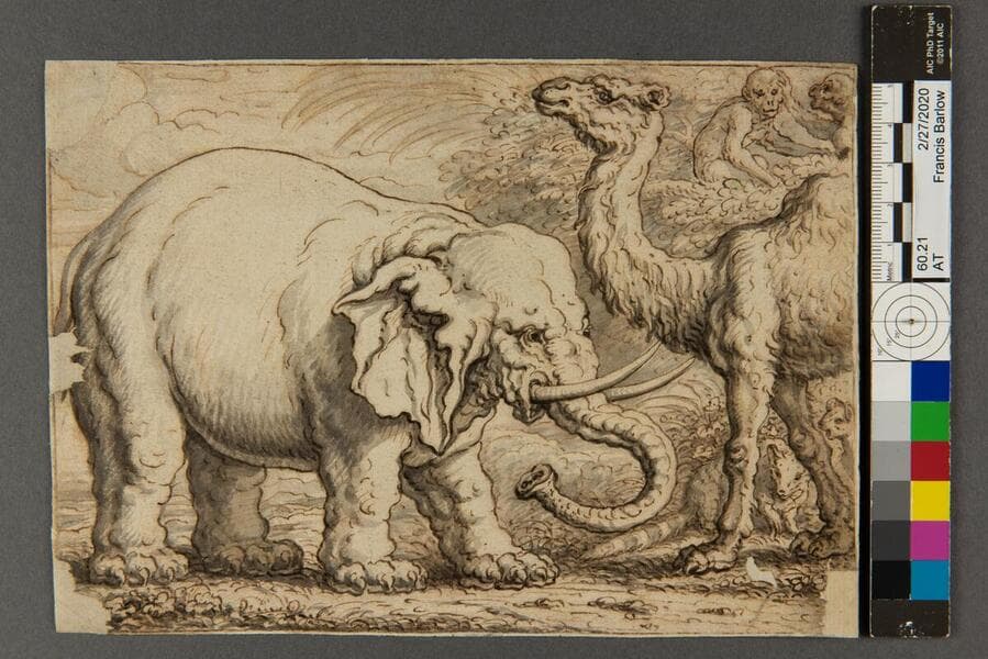 This image of exotic creatures is one of thirteen surviving drawings that Barlow made to illustrate a model book of animals he published beginning in 1659. The artist employs loose, energetic pen strokes to delineate the wrinkled skin of the elephant, flowing hair of the camel, short fur of the monkeys, and pointed muzzles of the two civet cats, at bottom right. It is highly unlikely that Barlow observed all these animals from life. Records show that an elephant was not displayed in London until 1675, and this example’s strangely ribbed trunk appears to have been based on an earlier print (2022).