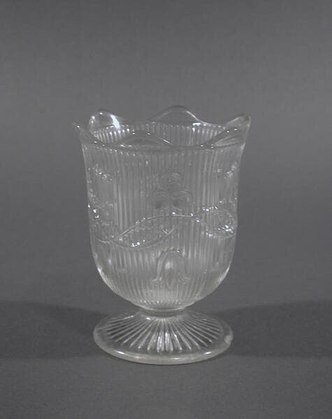 In 1607 a small glasshouse was erected at the settlement in Jamestown, Virginia, thereby distinguishing glassmaking as one of the first industries practiced in the North American colonies. The industry did not become firmly established until the nineteenth century, however, when a technological innovation allowed Americans to mass-produce glass tableware at affordable prices. As an alternative to the labor-intensive and highly skilled process of glass blowing, manufacturers developed heavy metal presses that could stamp hot glass into finished form in cast molds. This new technology revolutionized the industry. Pressed glass could be made quickly and cheaply in a wide variety of attractive patterns. By the 1840s celebrated makers such as the Boston Sandwich Glass Co. of Sandwich, Massachusetts, and Bakewell, Pears & Co. of Pittsburgh, Pennsylvania, were pressing tableware forms in matching patterns featuring both geometric and stylized, representational matifs. This glass has an especially high lead content, giving it the weight, bell-like resonance, and brilliance so prized by collectors.