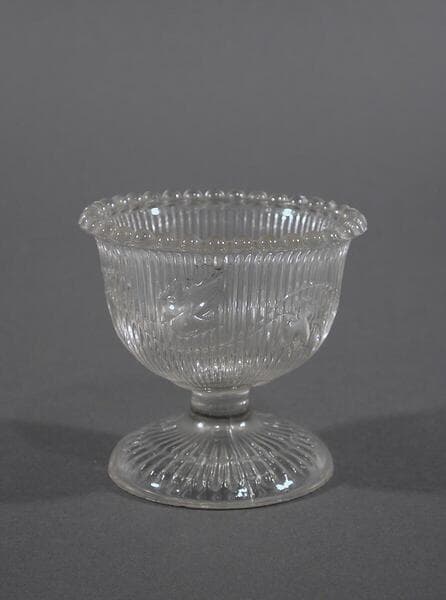 In 1607 a small glasshouse was erected at the settlement in Jamestown, Virginia, thereby distinguishing glassmaking as one of the first industries practiced in the North American colonies. The industry did not become firmly established until the nineteenth century, however, when a technological innovation allowed Americans to mass-produce glass tableware at affordable prices. As an alternative to the labor-intensive and highly skilled process of glass blowing, manufacturers developed heavy metal presses that could stamp hot glass into finished form in cast molds. This new technology revolutionized the industry. Pressed glass could be made quickly and cheaply in a wide variety of attractive patterns. By the 1840s celebrated makers such as the Boston Sandwich Glass Co. of Sandwich, Massachusetts, and Bakewell, Pears & Co. of Pittsburgh, Pennsylvania, were pressing tableware forms in matching patterns featuring both geometric and stylized, representational matifs. This glass has an especially high lead content, giving it the weight, bell-like resonance, and brilliance so prized by collectors.