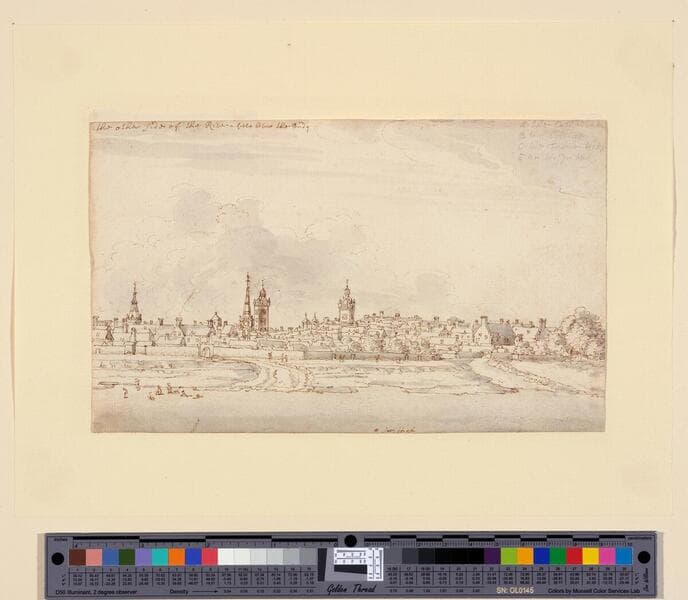 Owing to his family’s wealth, Place was able to travel widely, making the kind of sketching tours that would not become common practice among landscape artists until a century later. This drawing displays his attention to observed detail: he has rendered architecture in delicate lines, and he has achieved volume and shadow through subtle tonal washes. Place has annotated the sheet with a lettered key identifying prominent buildings, though the corresponding letters were never added or have been removed from the image. The town has been recently identified as Glasgow and the drawing has been dated to 1701.