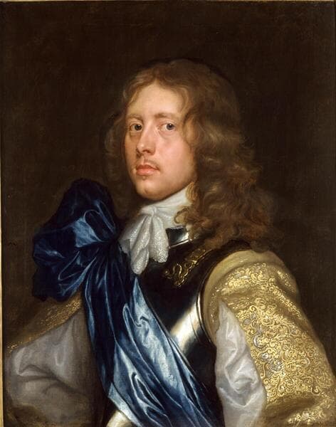 The focus of this portrait is undoubtedly D’Arcy’s glittering embroidered sleeve and blue silk sash, expertly painted by Weesop to mimic its smooth and reflective qualities. This costume identifies him as a commander for the Royalists, forces loyal to King Charles I in the English Civil War (1642–1651). In this devastating and deadly conflict, Royalists and those loyal to Parliament warred over the role of Parliament in the government. Aft er the Royalists lost the war and Charles I was beheaded in 1649, D ’Arcy was exiled to France along with the King’s son, the future Charles II.