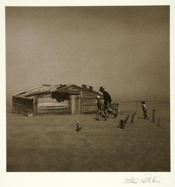 Farmer and sons walking in the face of a dust storm. Cimarron County, Oklahoma April 1936