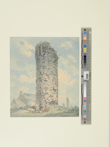 In the 1790s, Girtin was employed by the antiquarian James Moore to make finished watercolors based on Moore’s pencil drawings of historic structures, like the Abernethy Tower. This watercolor is calculated to appeal to the taste for the picturesque, which favored age, roughness, and variety. While the tower was actually well-preserved, Girtin depicts it as a ruin, with stones projecting irregularly, and a summit crumbling away beneath grass and lichen. He creates a contrast in textures, using small, light touches to evoke the softness of the vegetation, while broader strokes mimic the shadows and protrusions of the rough stone blocks (2022).