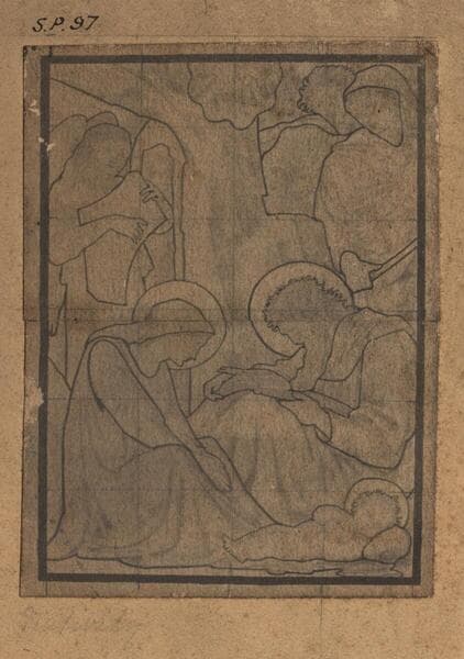 Photograph of stained glass cartoon. The photographhas been gridded with pencil - Mary and Joseph seated in foreground, Christ Child laying down at lower right - angel with dulcimer behind at left, star above at center and two shepherds at right.