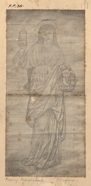 Photograph of stained glass cartoon: divided in two. Standing figure, hair falling down back, in long robes held up over left arm - holds wreath in left hand and vase in right. Gridded ground.