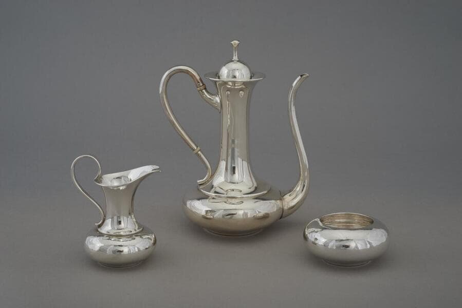 The shape of this Turkish-Style Coffee Service-including the pot's elongated handle and spout and its bulbous body-was inspired by vessels from the Middle East. While such historical design formats and motifs were of interest to both Clemens Friedell and Porter Blanchard, Blanchard's work was typically sparer, his elegant forms rarely embellished with ornate surface decoration.