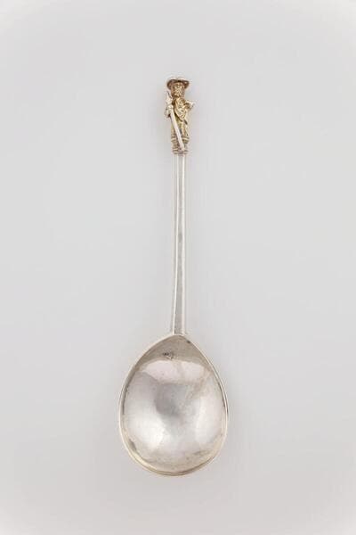 Each of these spoons (66.1.1-66.1.13) displays a small figure of an apostle, one of the twelve disciples Christ chose to preach his Gospel to the world. In an era when many children died in infancy, newborns were frequently named for one of the apostles—who became the child's patron saint and protector—and sets of such spoons were popular baptismal presents to godchildren. The group is one of very few sets of such an early date that survive intact.