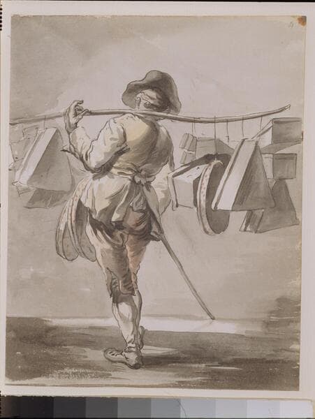 This image of a hat box seller belongs to Sandby’s London Cries, a series of figure studies that take as their subject the city’s street merchants. Cries refers to the calls the sellers made to attract customers’ attention. The series follows a long tradition of European imagery of itinerant performers and traders. While many of the figures in Sandby’s London Cries are markedly unpleasant, the Band Box Seller is a study in elegance. The figure is depicted from behind as he walks away from us, a variety of boxes dangling from a pole perched on his shoulder. Under its weight, his body curves sinuously, as if performing a dance (2022).