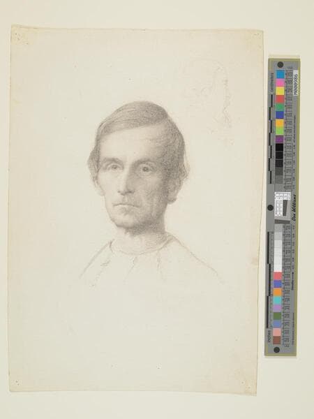 This haunting self-portrait captures both outward appearance and inner psyche. The artist pictures himself in a simple smock that recalls the robes of a monastic order. The recessed, staring eyes do not focus on any exterior object, but instead appear to witness an interior vision. Smetham was an intense, deeply religious man. Following a mental and physical collapse in 1877 he was committed to an asylum. The profile sketch of a man in the upper right corner of this drawing probably represents Dante Gabriel Rossetti, a friend and supporter of the artist.