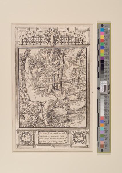 Crane was a successful illustrator and writer of children’s books. This drawing is a design for a full-page illustration in one of his most ambitious publications. Household Stories from the Collection of the Brothers Grimm was first published in 1882 as a lavish edition of fifty three fairy tales featuring over a hundred illustrations. The drawing was made for The Goose Girl, the tale of a princess forced to work as a lowly laborer by the evil handmaiden who assumed her royal identity. In this scene, the princess calls up a wind to blow away the hat of a bothersome boy (2022).