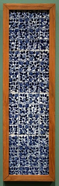 - Tile divided into sixteen squares separated by blue wavy lines on white ground. Each square contains blue fruit or leaves.