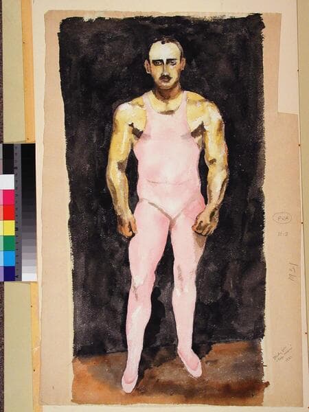 Walt Kuhn's monumental oil painting of Vittorio Falconi (directly to the left) emphasized the extremely muscular upper body that made the trapeze artist a great "top man." The attention Kuhn paid to his arms, shoulders, and chest makes his head and legs appear slightly out of proportion. In this watercolor and graphite study, however, Kuhn seems to have beem interested in portraying Falconi's personality by more fully developing his facial features, particularly his heavily lidded eyes, to give a sense of the psychological impact of the life-and-death responsibility Falconi had for his fellow performers. In the study, Kuhn also made Falconi's body slightly smaller, further accentuating the precariousness of his dangerous work high above circus crowds.