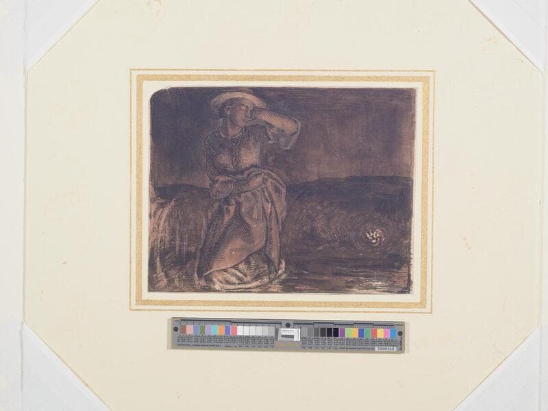 Hunt noted in his diary on November 14, 1855, that he saw the “will-o’-the-wisp” while on an evening stroll. The experience likely served as the basis for this drawing, in which a spiraling ball of white seems to pulse against the dark background. Though its phosphorescence is a natural phenomenon, the will o’-the-wisp appears in British folklore as a ghostly light believed to lead travelers astray. In Hunt’s hands, it serves as a typical Victorian allegory of what can happen when a girl allows herself to be ruled by her desires. He depicts the moment when the figure, writhing in torment against the call of the phantom, is about to give in and plunge into the blackness that surrounds her (2022).