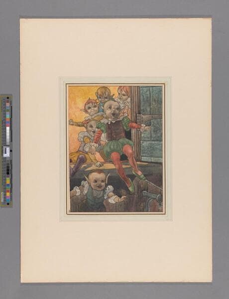 Impish hobgoblins float through an open window in Charles Robinson's watercolor. Robinson and his two brothers were among the most prolific illustrators of fairy tales in this period. He brings his skill in rendering scenes from fantasy to this description of the generally friendly but troublesome creatures of folklore. Often found inside human dwellings doing odd jobs, hobgoblins can become frightening and even dangerous when misused. This watercolor captures their changeable nature. Though Robinson's hobgoblins have the delicate bodies and heads of children, their distorted features lend them an unsettling quality.