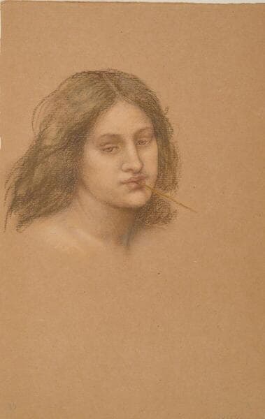 Known for her allegorical and literary paintings, De Morgan has instead chosen a simple, evocative subject for this pastel: a country girl absently chewing on a reed or bit of straw. The very image of someone lost in thought, the figure’s downcast eyes lend her a faraway expression. The artist enhances the dreamlike mood of the drawing by manipulating the application of pastel. She smudges the material in some areas and allows the lined texture of the paper to show through in others, giving the drawing a soft, slightly unfocussed quality. The full lips and flowing hair of this figure are typical of the Pre-Raphaelite image of women, though De Morgan eliminates the moralizing subtext often associated with female subjects in the work of her male counterparts.