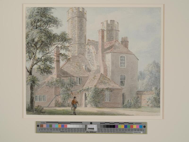 Watercolor over traces of graphite on laid paper Sandby’s precise delineation of the cemetery gate of the medieval monastery of St. Augustine in Canterbury reveals his early training as a military draftsman. However, he has composed the image in a way that goes beyond simple topography. The angle at which he views the structures is one that maximizes the visual interest of the subject. A wide variety of shapes—from the flat planes of the walls to the round towers to the arched windows—enliven the image. Textures range from the soft green leaves of the trees to the rough bricks of the chimneys to the even rougher stone of the towers. The emphasis on variety and irregularity places the drawing within the aesthetic category of the picturesque (2022).