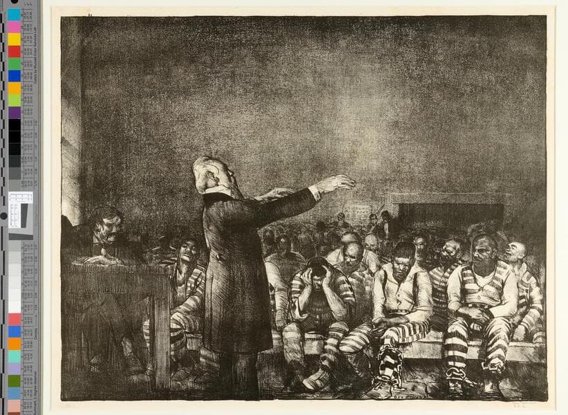 Bellows grew up in a highly religious home and produced a series of prints on the impact of religion that he exhibited in 1918 as "Studies in Belief." He intended the scene of a white minister towering over black convicts to be a study in hypocrisy, making it one of his most political prints. The image also appeared as an illustration in the Socialist magazine The Masses, which was critical of racial discrimination and the role of evangelical religion in the United States.