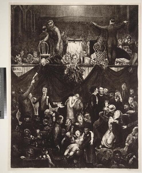 In 1915, Metropolitan Magazine sent Bellows and journalist John Reed to Philadelphia to cover the revival meeting of Billy Sunday, the most popular Christian evangelist of the early twentieth century. The large audience gave Bellows the opportunity to observe the behavior of crowds and to depict people in extreme emotional states. The Sawdust Trail concentrates on the worshippers. A man on the left reaches up to shake Billy Sunday's hand.