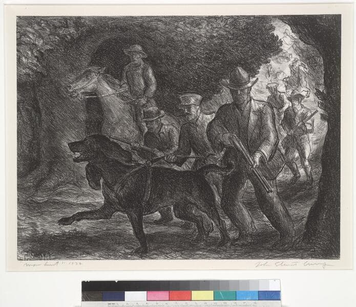 John Steuart Curry designed these images to arouse sympathy, direct attention to the problem of racial violence, and effect social change. He sent the lithograph and painting of The Fugitive and the painting of Manhunt to the exhibition "An Art Commentary on Lynching," sponsored by the National Association for the Advancement of Colored People in 1935, part of their lobbying for anti-lynching legislation. The Fugitive is a powerful image of an African American in a Christ-like pose fleeing the mob intent on killing him, while Manhunt concentrates on the blood-thirsty mob itself. In both prints the outcome of the man's fate remains unresolved.