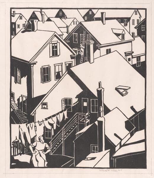 After studying printmaking in Paris, McMillen settled in Provincetown, Massachusetts, on Cape Cod in 1950. Even at that early date, the town was known as an artistic community. In this striking woodcut, McMillen plays with the steeply pitched roofs and the line of laundry strung in the foreground, emphasizing the geometric rhythm created by the Provincetown buildings.