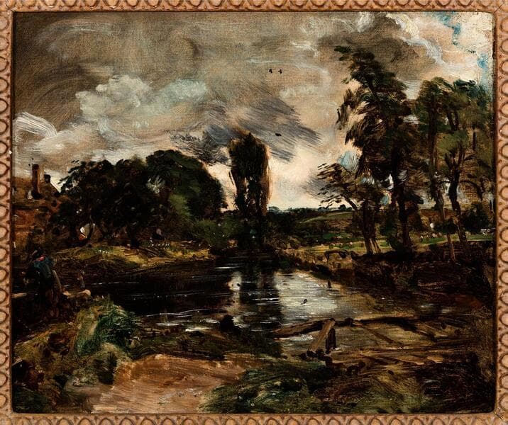 This oil sketch is one of at least five that Constable made during the summers of 1810 and 1811 as preparatory studies for his large painting of A Water-Mill: Flatford Mill, Suffolk, 1812. Constable honed his technical and observational skills by sketching outdoors in the vicinity of his childhood home, near the village of East Bergholt, Suffolk. Constable was concerned with capturing the emotional atmosphere of the place, as well as its physical topography. He made the present sketch from the south bank of the Stour River, looking downstream. In the left foreground, a man is shown operating the lock gates, and beyond him we glimpse a corner of the water mill owned and operated by Constable’s father, revealing the artist’s personal connection to the landscape.