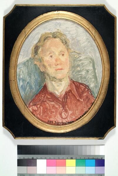 - Oval portrait of head and shoulders of a mild-mannered woman