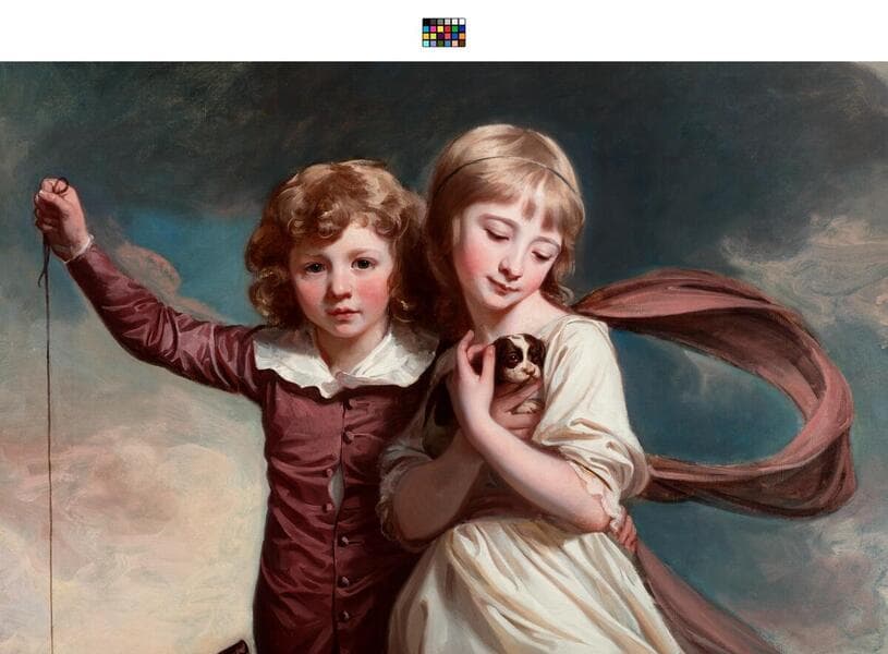 This portrait vividly demonstrates the way differences between boys and girls were viewed in the 18th century. Thomas holds the reins of power, grasping his dogs’ leash assertively, while his sister Catherine is cast in a more nurturing and submissive role, hugging a puppy to her chest. Through costumes that evoke the ancient past and a composition that makes these children tower over the low horizon, Romney lends his young subjects a seriousness and monumentality rarely seen in portraits of young children.