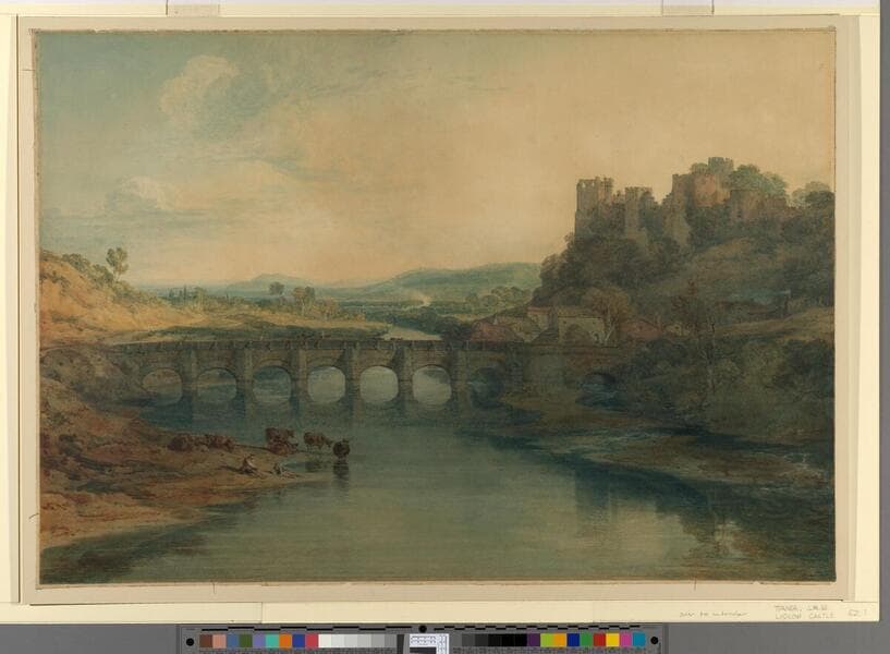 Turner considered large, finished watercolors like this one comparable to oil paintings, both in their scale and in the amount of labor required to produce them. Instead of broad, quickly applied strokes, he has built up layers of transparent washes to create a rich, warm glow. The castle, looming over the valley, is silhouetted against a golden sky, with its grounds bathed in soft blue shadow. Though Ludlow Castle is based on a sketch of the castle the artist made on the spot, the drawing is less a response to the specific landscape and atmospheric conditions he experienced than it is a learned reference to past art. With its high, distant viewpoint and gentle, even light, it recalls the timeless, classicizing landscapes of seventeenth century French painters (2022).