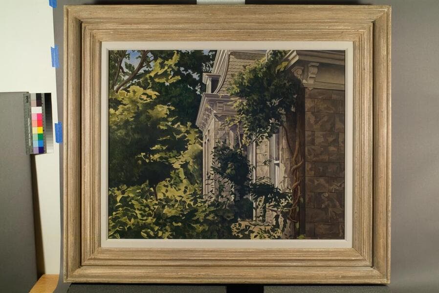 Bird's Nest depicts Charles Sheeler's home in Irvington-on-Hudson, New York, just up the Hudson River from Manhattan. Throughout his career, Sheeler portrayed his homes from unusual vantage points, emphasizing the abstract patterns created by their architecture. Sheeler's tendency to depict simplified geometric forms in bright, clear light with few visible brushstrokes affiliates his work with Precisionism. Precisionist artists typically used eccentric compositions that invited viewers to experience familiar objects-such as a house-in a new aesthetic context.
