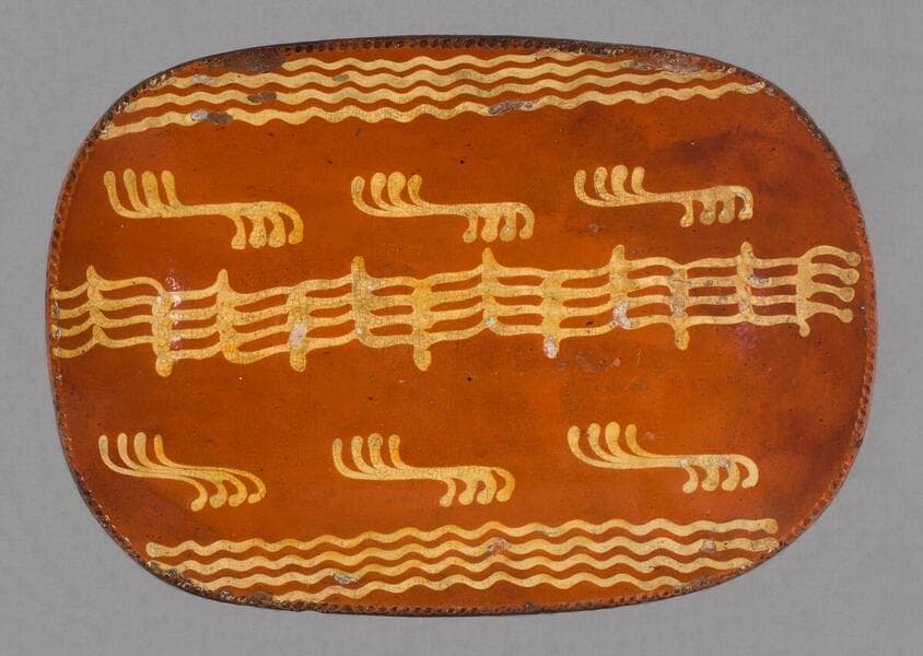 Lead-glazed earthenware, known today as “redware,” was produced in America from the early 1600s well into the 19th century. Pressed into molds rather than thrown on a potter’s wheel, redware vessels were made from porous clay. Fired at relatively low temperatures, they required glazing to render them watertight. Decorative designs or inscriptions such as those seen on this plate were applied in yellow slip, a thin watery clay, prior to firing.
