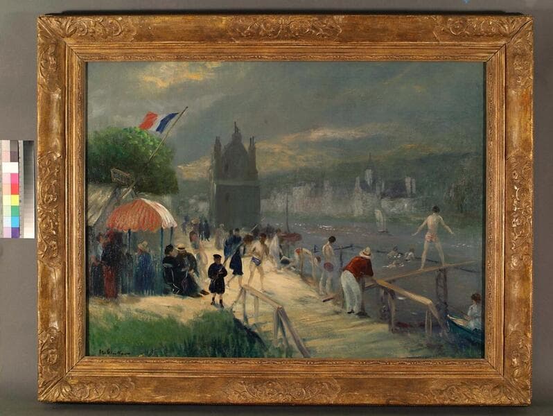 William Glackens worked as a newspaper and magazine illustrator in Philadelphia before first traveling to France in 1895 with fellow Ashcan School artist Robert Henri. His ability to sketch scenes quickly is evident in this painting that captures a vibrant tableau of life along the Marne River in the French village of Chateau-Thierry, which Glackens visited on his honeymoon in 1906. The man and woman in bathing costumes crossing the sunlit path in the middle ground are Glackens and his new wife, Edith; the figure in red swim trunks who is about to dive into the water is their freind, the American artist Alfred Henry Maurer.