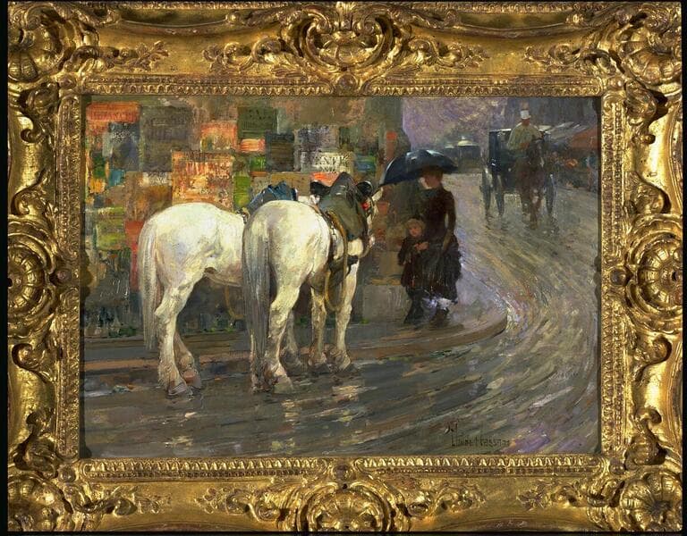 In painting this scene of Paris, Childe Hassam took the point of view of a flaneur, a person who makes keen observations of the urban environment. He recorded the vibrant interplay of colors, shapes, and textures on an otherwise undistinguished street corner on a rainy day. Rounding the corner, a well-dressed woman shelters herself and a child with an umbrella, while in the distance a fiacre, or horse-drawn cab, moves down the street. At the time, Paris was home to over 90,000 horses that powered machines and transported goods, information, and people, prior to the rise of the automobile and the city's metro system. Hassam was based in New York and New England, but he traveled to Europe throughout his career, including a stint in Paris from 1886 to 1889. Paris Street Scene is characteristic of Hassam's work after he arrived in France, when he concentratred on capturing fleeting moments in time and atmospheric effects.