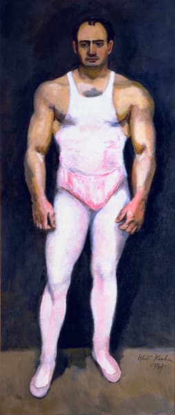 Top Man depicts trapeze artist Vittorio Falconi. As the "top man," Falconi choreographed and directed the performance. During the act, he hung by his knees from the trapeze and caught the other performers as they left the fly bar. Portrayed by Kuhn in the costume of his trade, he stands on a bare floor, exhibiting his muscular arms, large well-developed hands, and monumental chest-the physical attributes of his profession. His pensive expression conveys the intellectual aspects of his artistry. Kuhn considered the painting one of his "best to date."