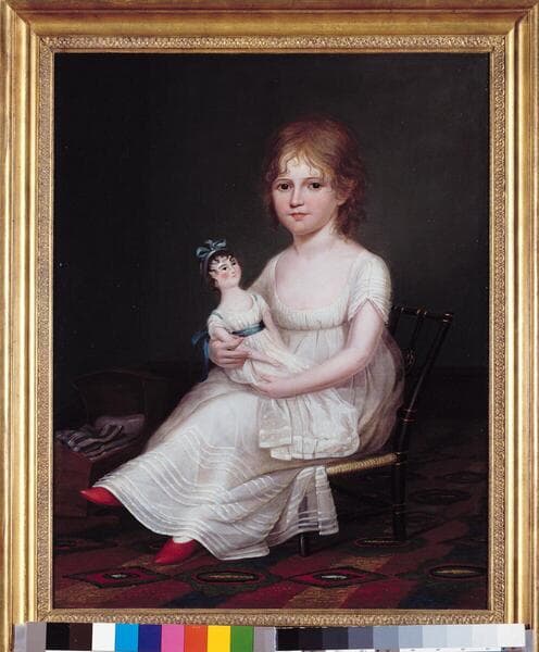 A Girl Holding a Doll celebrates material abundance and the increasingly domesticated role of women in American society during the 19th century. Peale's anonymous subject sits in an ebonized and gilded, turned-wood chair made especially for children. Like the chair, the elaborately patterned rug, carved wooden doll, and doll's cradle indicate that the girl comes from a wealthy home. Her dress is in the latest French Empire style and her wispy hair falls loose around her face, reflecting a new emphasis on naturalism in this period. The doll, dressed in the same fashion as her owner, and the cradle foreshadow the little girl's likely future role as a wife and mother.
